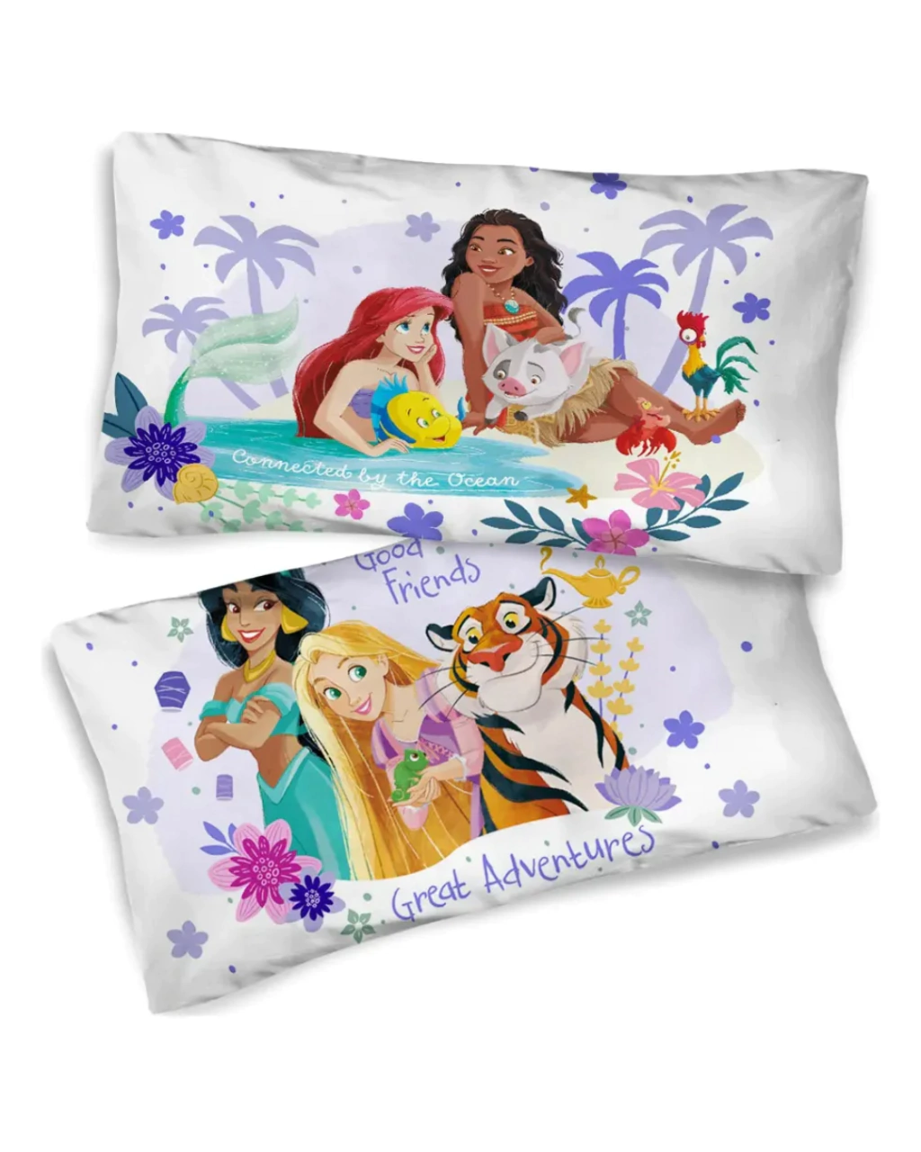 Dale un toque mágico al dormitorio de los más pequeños con este encantador juego de sábanas que incluye tres piezas con las princesas favoritas: Rapunzel, Moana, Cenicienta, Sirenita y muchas más. La funda de almohada reversible permite cambiar el diseño fácilmente para crear un ambiente lleno de fantasía.